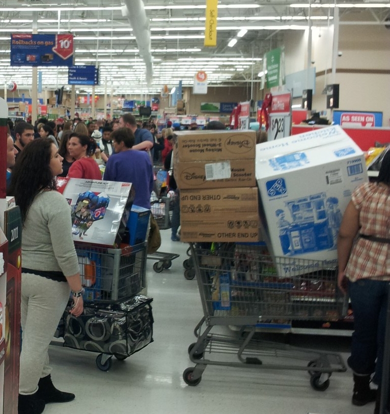 As I stepped in through the automatic doors, I could not have entered a more alien scene had I been dropped into the Mos Eisley Cantina. Everywhere I turned, there was a long line, emanating from a Mylar balloon with a product printed on it. Remembering that we were out of pull-up diapers, I spent 20 minutes meandering through the store, avoiding the blocked off aisles and walls of people waiting on everything from HD televisions to video game systems to bicycles.