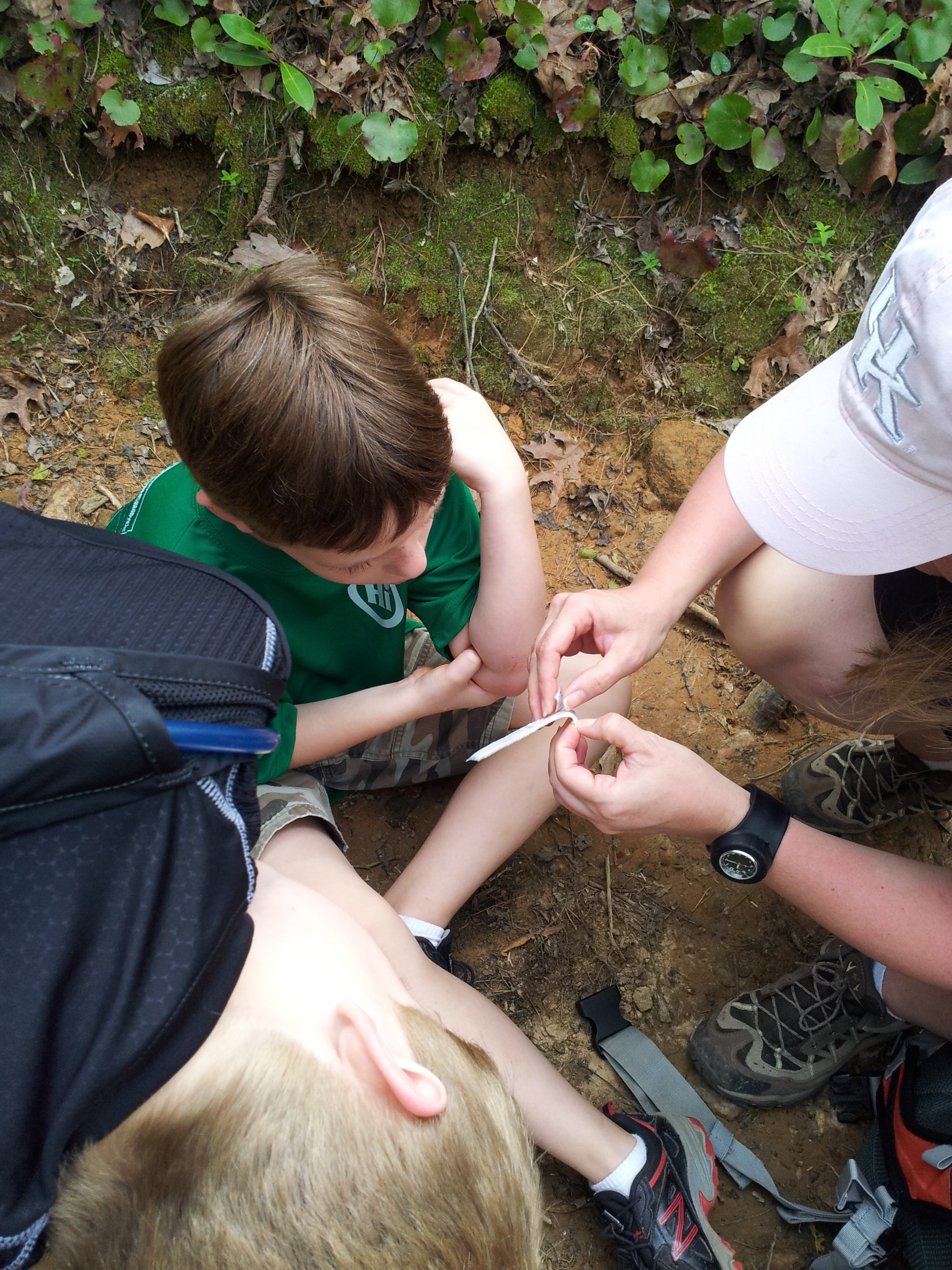 Anna took my pack as I carried Harris on my back for a couple hundred yards, crossing a creek and seeing a water snake. The encounter helped distract Harris from his injury, and soon he was moving under his own power again, and I was able to relieve Anna of my pack.