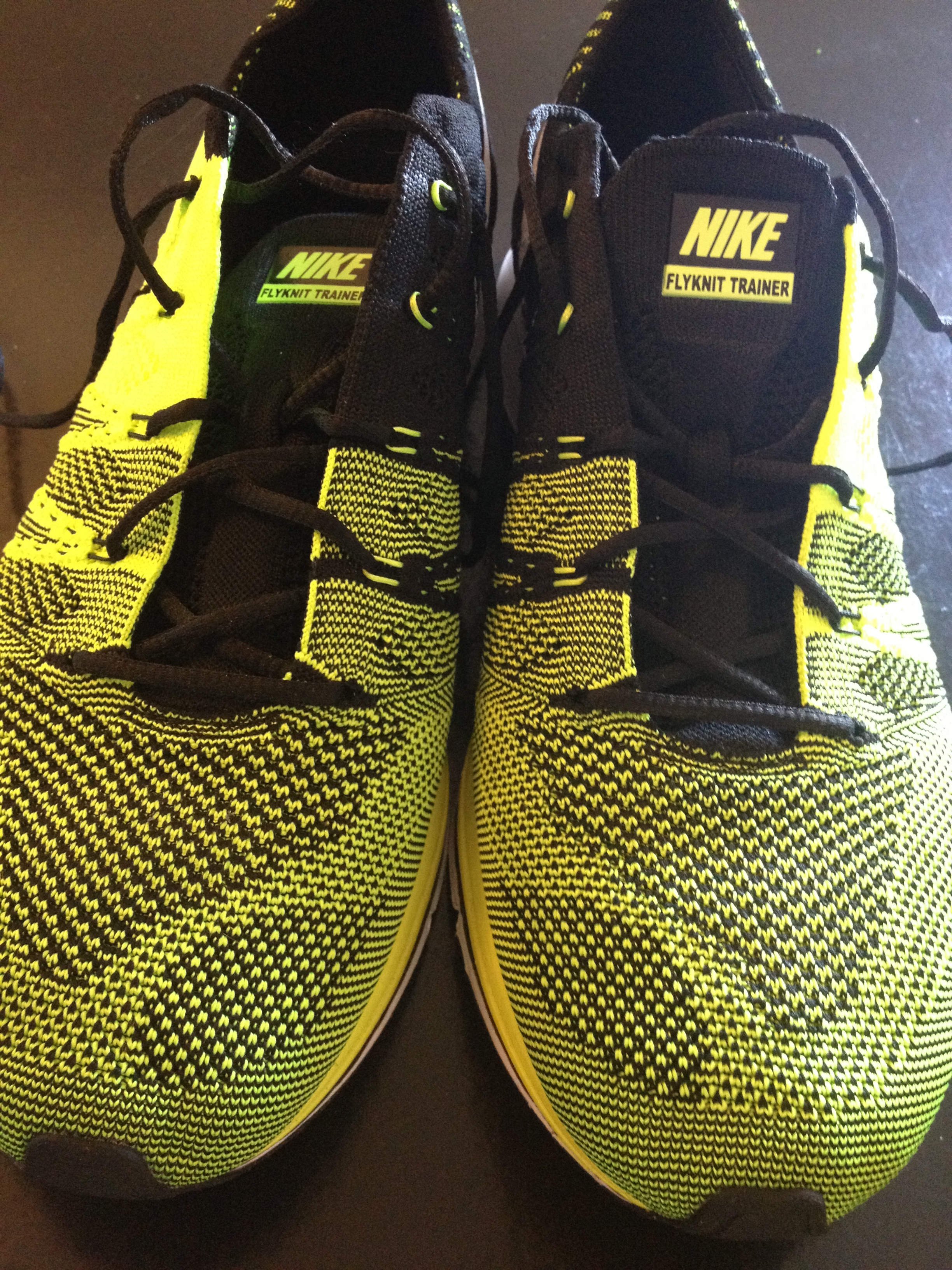 I donned these hideous shoes and trotted around a bit. They felt good and actually did make me run on the balls of my feet. But it wasn’t $170 worth of improvement, so I tried out the sports car model. These chartreuse Nike’s Flyknit Trainers were the lightest shoe I had every picked up. Made with engineered fabric, the shoes weighed just 1.2 ounces each. For legs that aren’t getting any younger, I swallowed my pride and bought the brightest pair of shoes I will ever own.