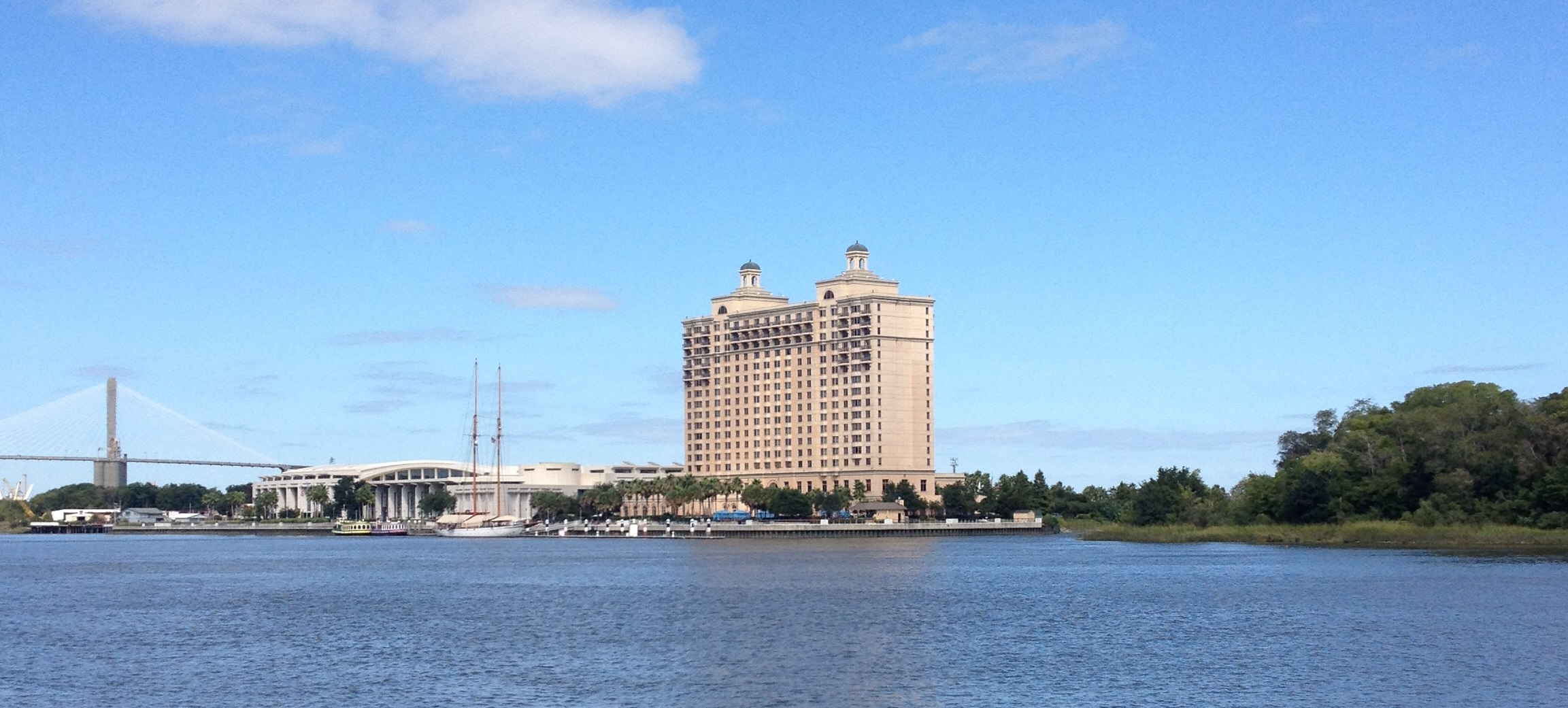 We stayed at the Westin Savannah Harbor overlooking the Savannah River, and were treated to a great, 11th floor view of the channel and its bustling activity: freighters laden with containers, tugboats trailing or pulling the container ships, ferries running tourists back and forth to River Street and even the occasional personal watercraft piloted by those who don’t think the last weekend in September is too late in the year to be in the water.