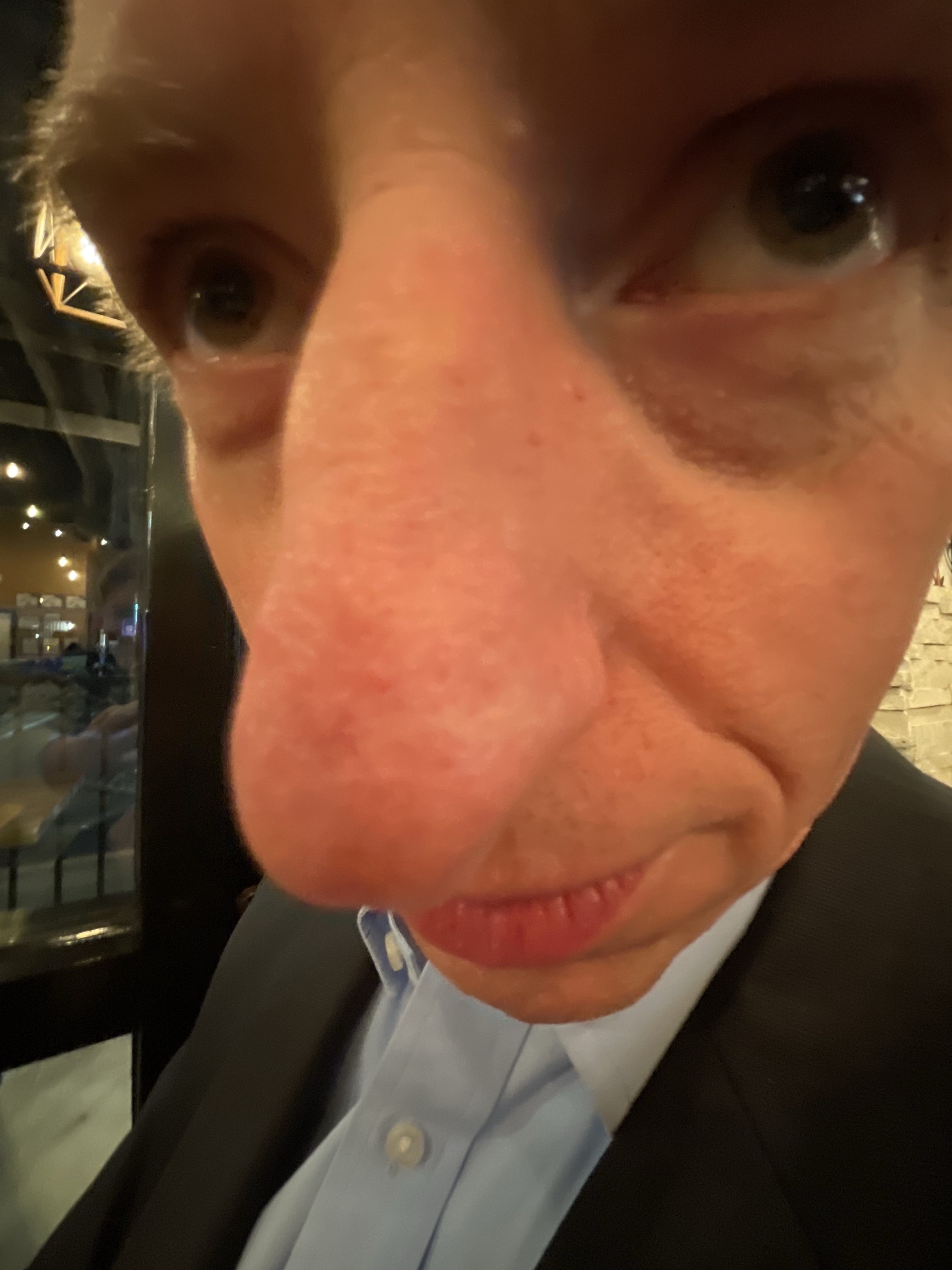 He held his phone up to my forehead or chin while I was otherwise engaged, including driving, and snapped a picture. The resulting image gave him great joy as he giggled and shared it with a text group of his close friends.