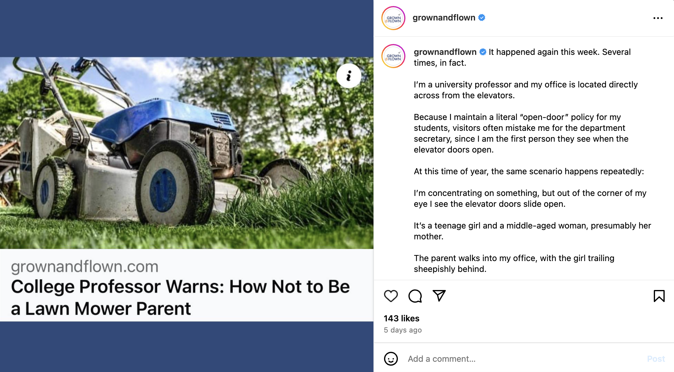 From “helicopter parenting” to “lawnmower parenting” and even “bulldozer parenting,” much has been made on social media, in the press and scholarly journals on the impact on a person’s psychology when parents are too involved in their children’s lives and deny them the opportunity to overcome obstacles on their own.