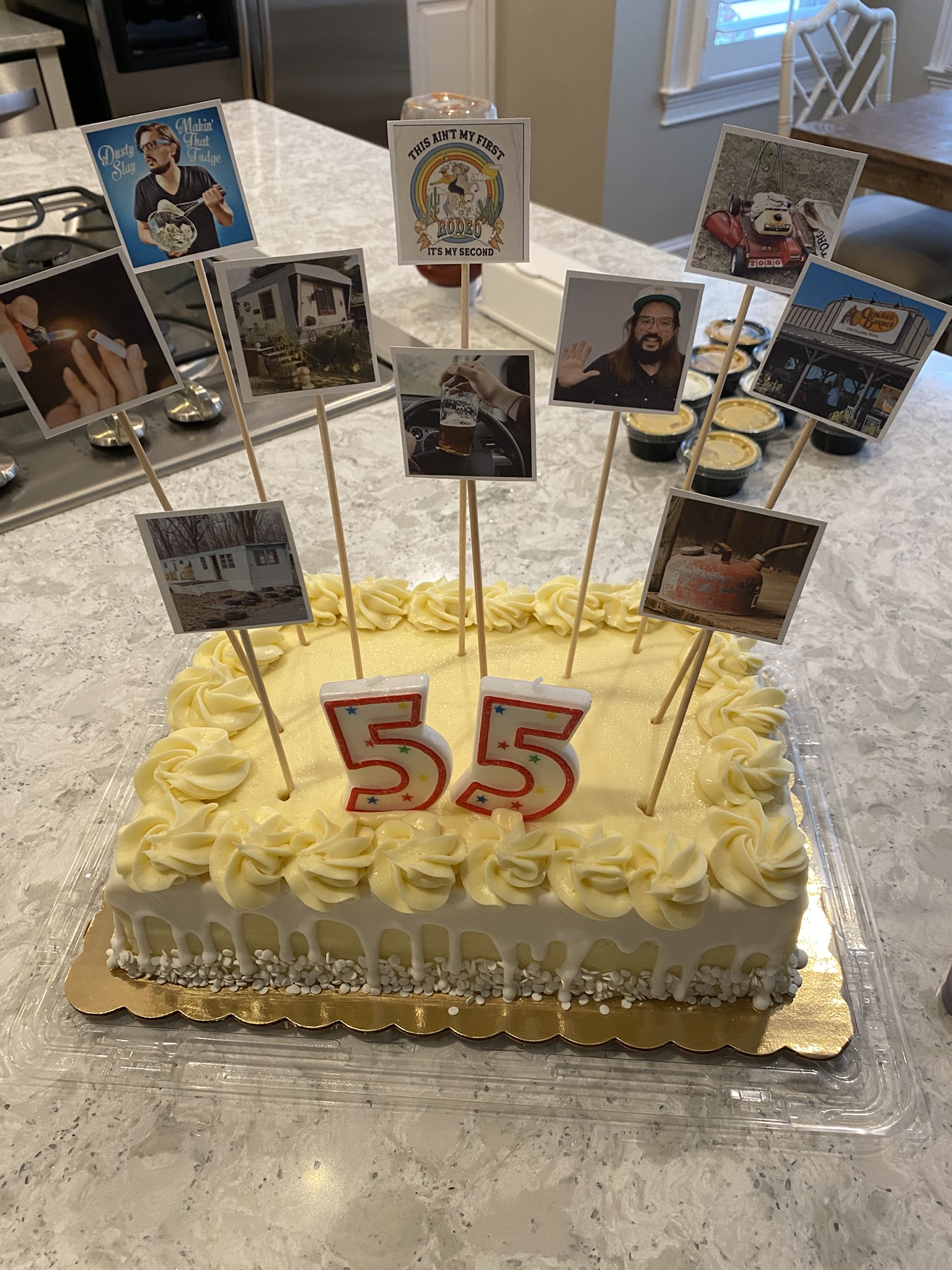Now, unlike a Star Wars or GI Joe or Scooby Doo birthday party from back in the day, my 55th birthday party didn’t have matching cups, plates and napkins with Dusty’s face emblazoned on them. (His team should really consider that for his merch.)
