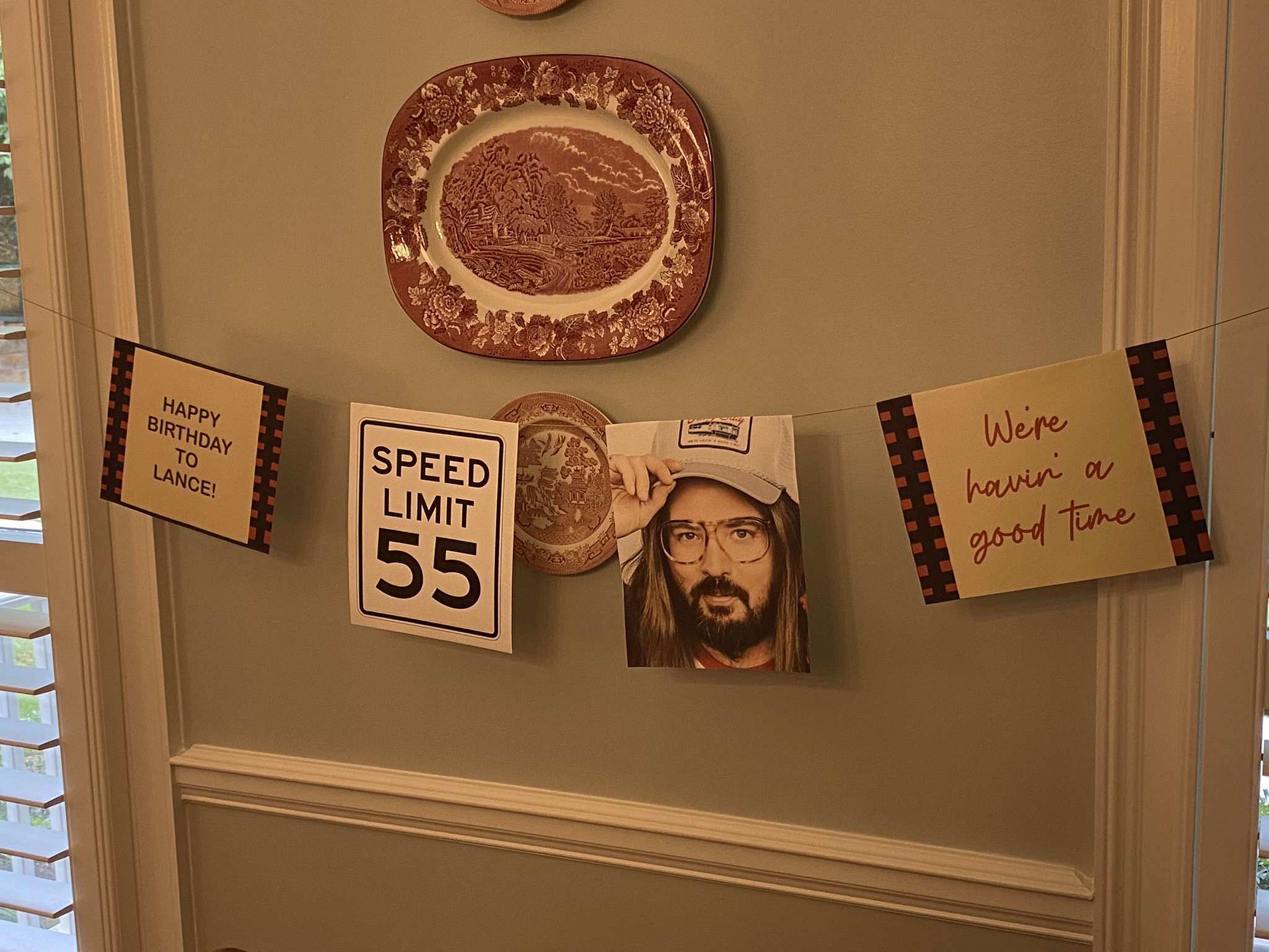We did have a cake with Dusty things sticking into it, a string of Dusty images hanging in the celebratorily decorated dining room, and plates and napkins in a plaid pattern (which I guess is Dusty’s favorite color?) Carla also ordered up a buffet of catered items from Cracker Barrel, on account of Dusty being their spokescomedian.