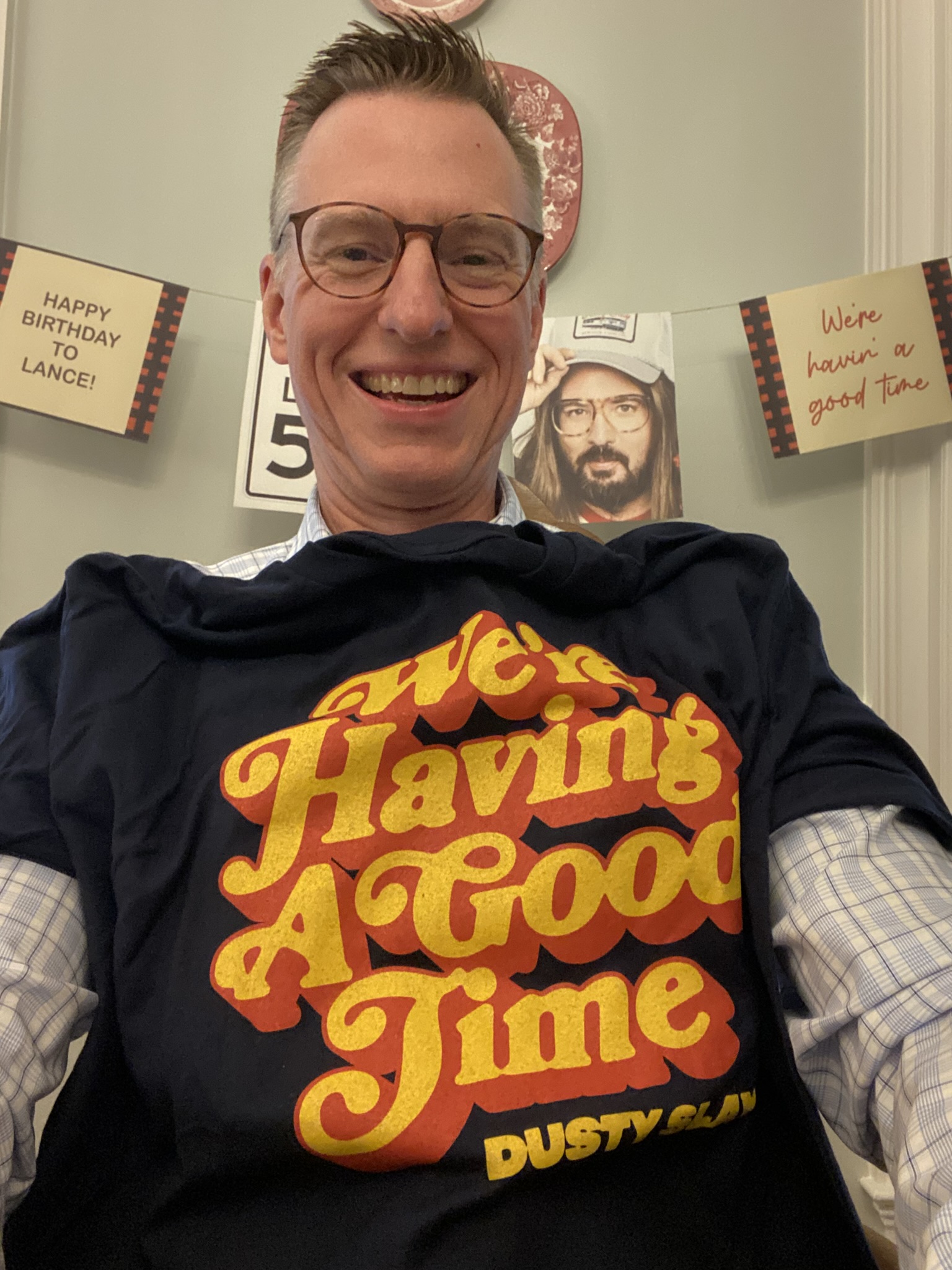 A man with a black T-shirt with the words "We're Having a Good Time" and "Dusty Slay" on it.